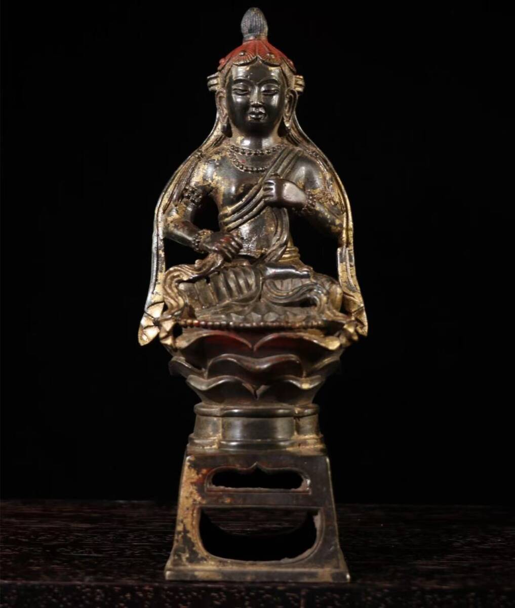 > 仏像 清代 旧蔵 純銅蒔絵朱砂仏像【観音菩薩】 チベット古寺 銅製 銅琉金 唐物 收蔵品 時代物 古置物 希少珍品 供養品 文房具 仏教6.26