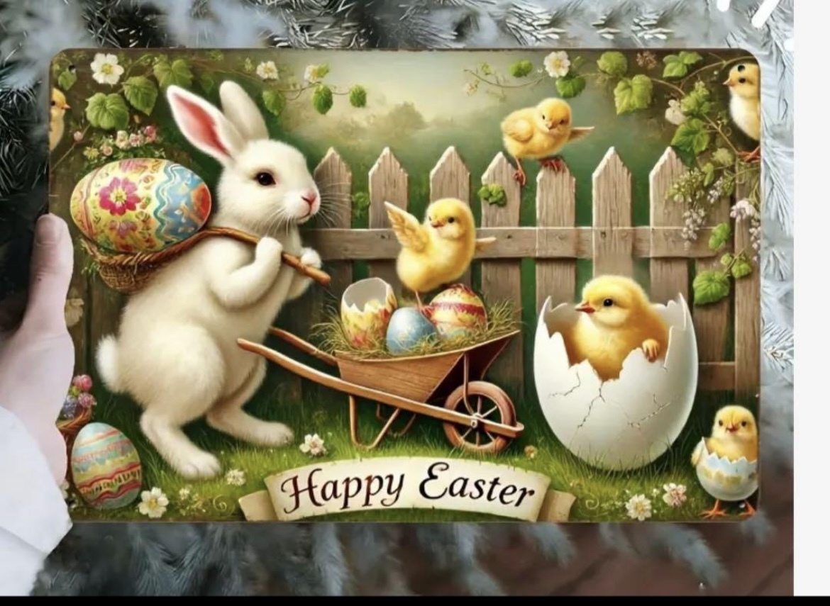 - ブリキの看板 イースター うさぎとヒヨコ ガーデン カフェ 新品