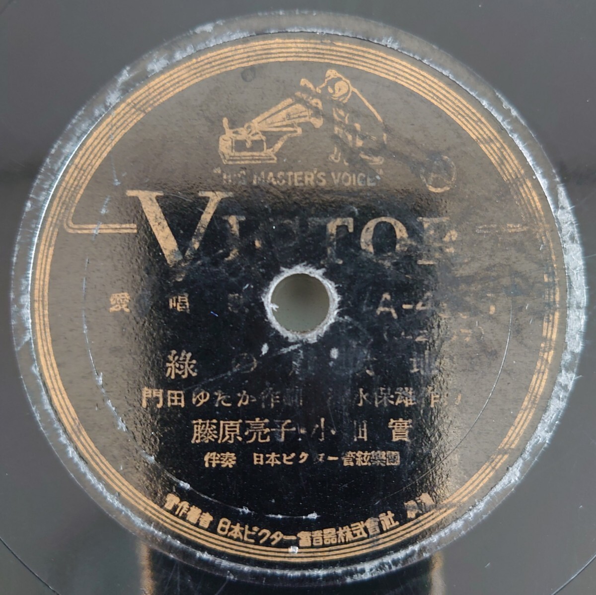 - 【SP盤レコード/レーベル付近薄ヒビ・穴】VICTOR A-4365 愛唱歌/綠の処女地-緑の処女地 藤原亮子・小畑實/バタビヤの夜は更けて 灰田勝彦