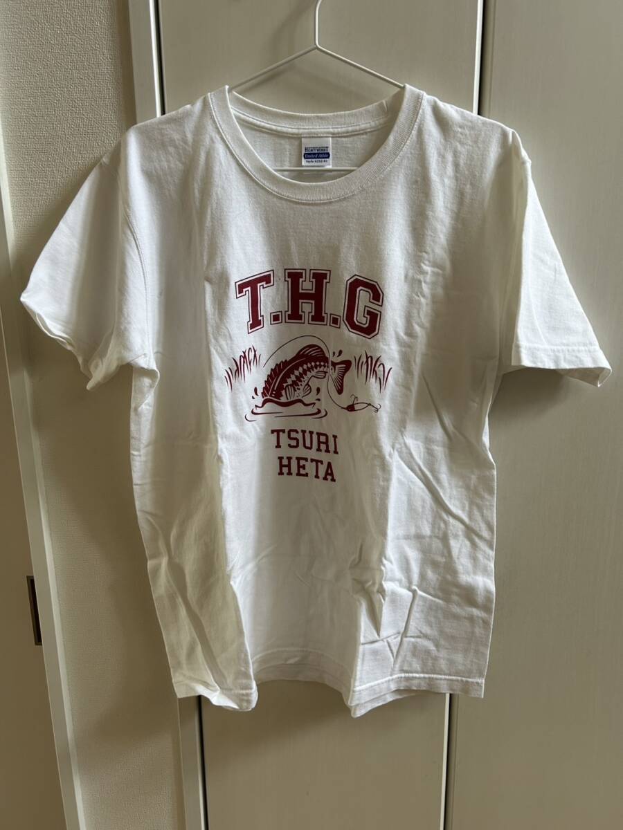 > T.H.G TSURI HETA Tシャツ バス釣り カレッジロゴ風 SIZE L United Athle 中国製 綿100% キャブ株式会社 右胸に少汚れ有 白色ホワイト系