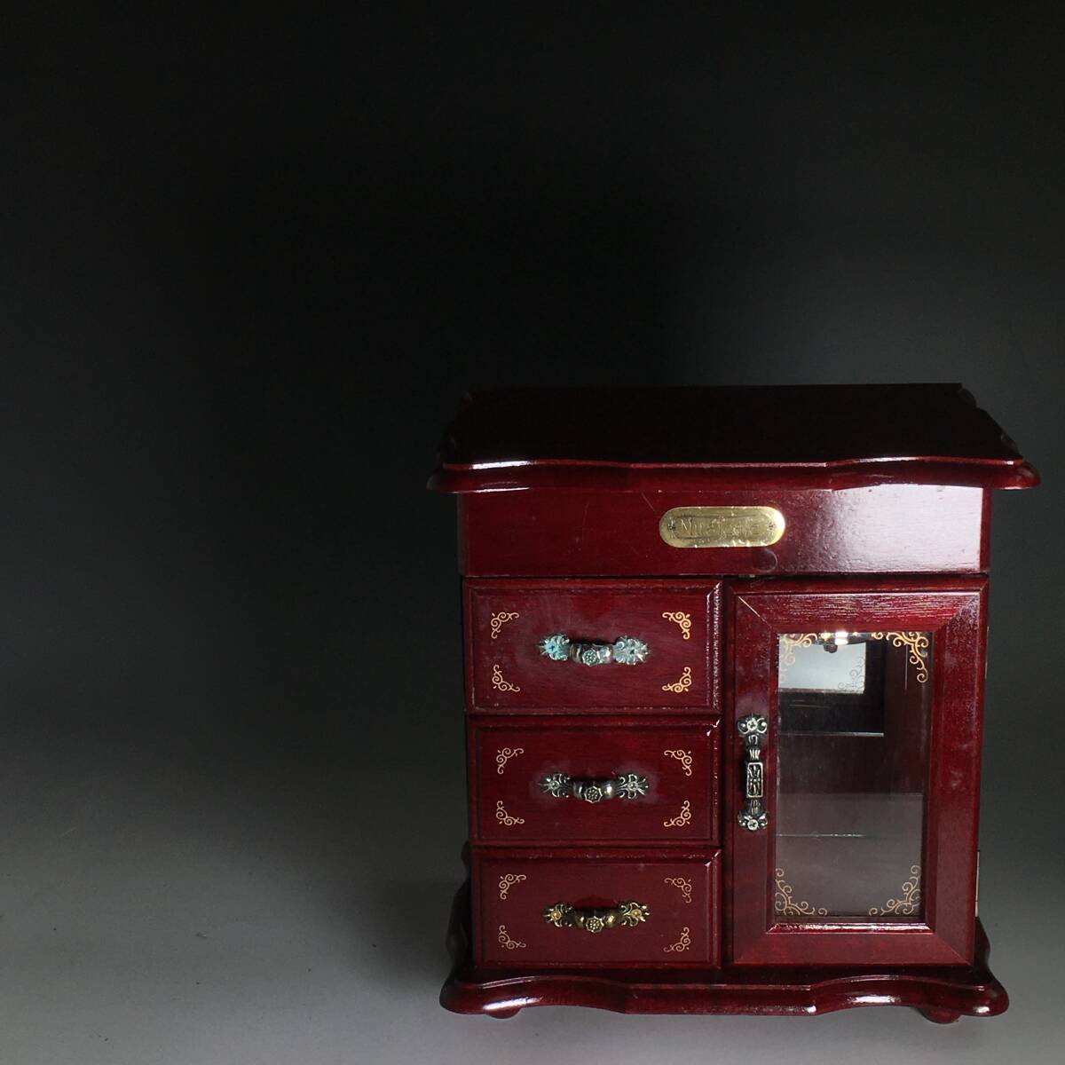 - FNY27/16【昭和レトロ】オルゴール付き 『スモールワールド』ジュエリーケース 木製 小物入れ 収納 アンティーク ※音出し確認済■