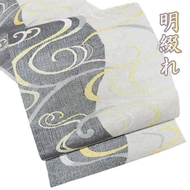 - 夏物 夏帯 袋帯 中古 リサイクル 正絹 フォーマル 仕立て上がり 六通 明綴れ 流水模様 銀通し 薄灰色 黒色 金銀 きもの北條 A1227-17