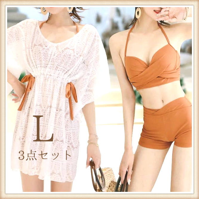 - L 3点セット 水着 メッシュ ワンピース レディース 茶 タンキニ ブラウン ビキニ ラッシュガード