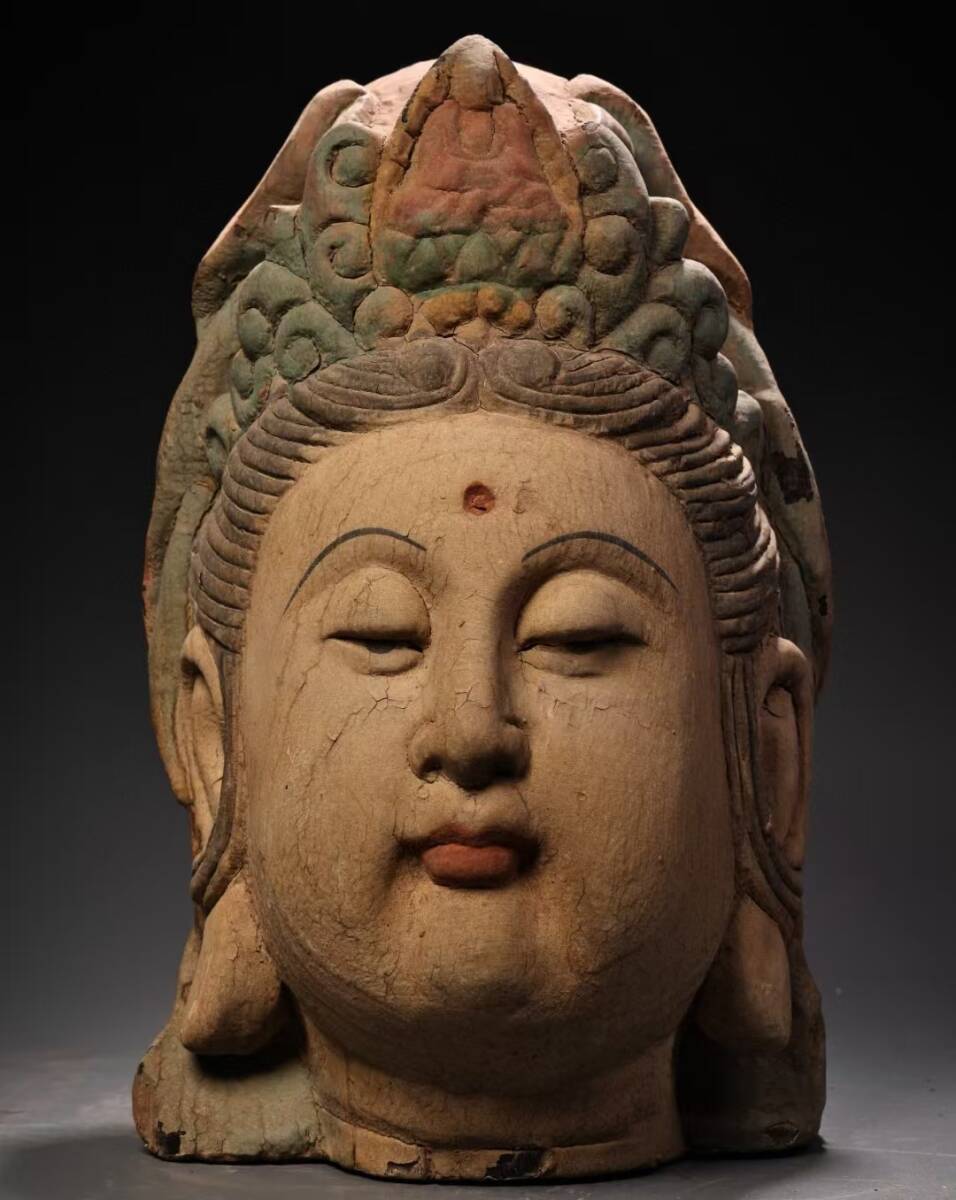 > 古木彫り 秘藏 清代 彩色古木彫り観音菩薩仏頭像 書道具 文房具 時代物 中国古美術 細密彫 置物 賞物 唐物 木彫り 文玩 6.28