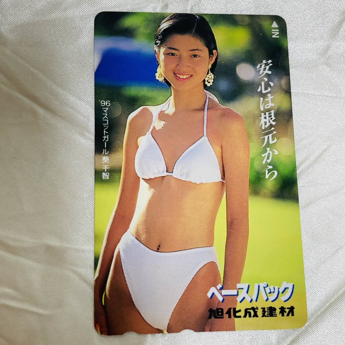 - SK 葵千智 旭化成建材 ベースパック 96年 マスコットガール ビキニ 白 テレカ 未使用 テレホンカード 50度数