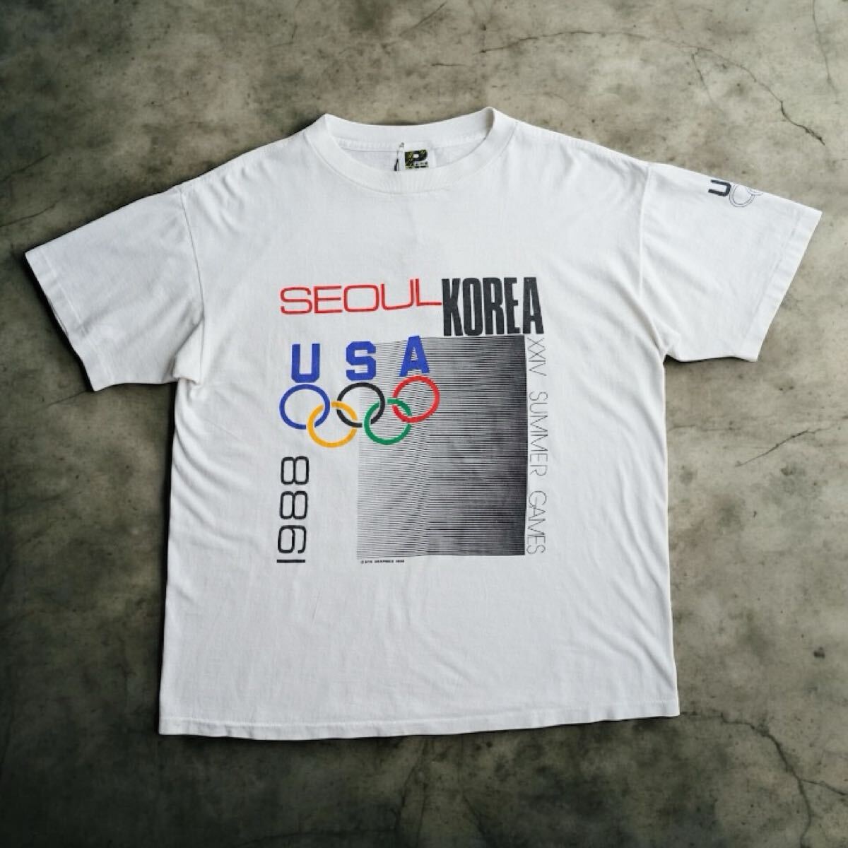 > 【80sヴィンテージ PROS ONLY】ソウルオリンピック 1988 ヴィンテージTシャツ Lサイズ 白 韓国買付 USAロゴ 五輪 古着 ホワイト SEOUL