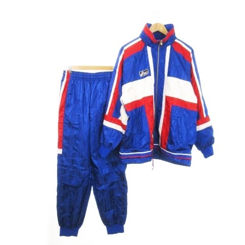 > asics ジャージ セットアップ 上下 トラックジャケット スタンドカラー フード収納 ロングパンツ ロゴ ワッペン 総柄 スポーツ O XL 青