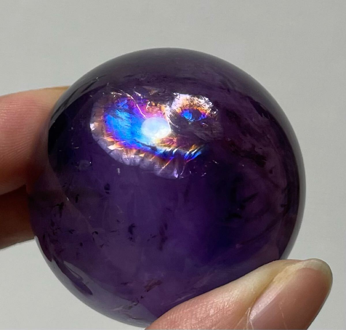 - 高品質アメジスト スフィア 丸玉 アイリスクォーツ ハート模様 虹入 紫水晶 クリスタル 浄化 魔除 お守 幸運 ラッキー パープル 開運