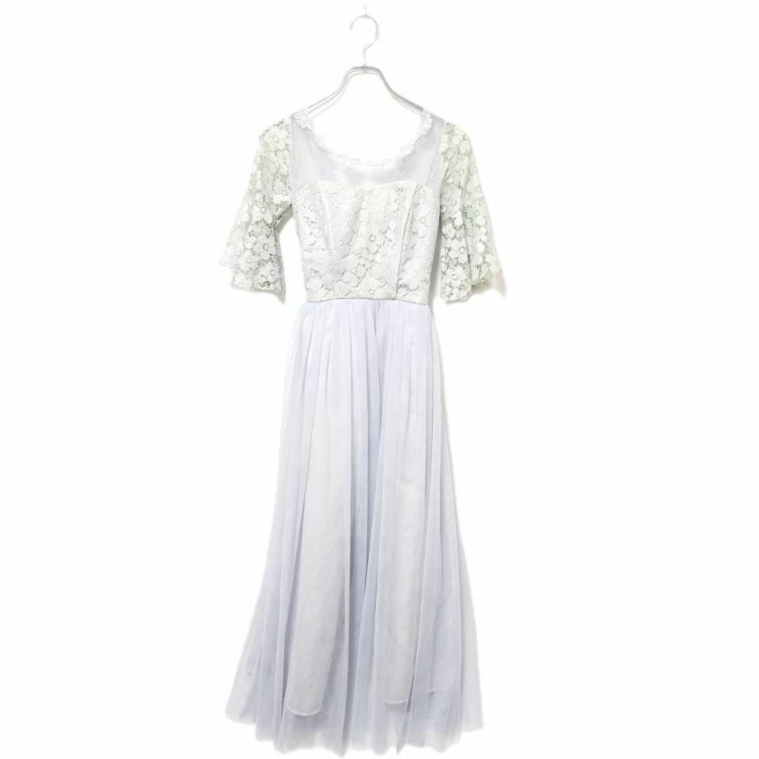- ロングドレス グレー L レース袖 チュール フレア Aライン フォーマル 上品