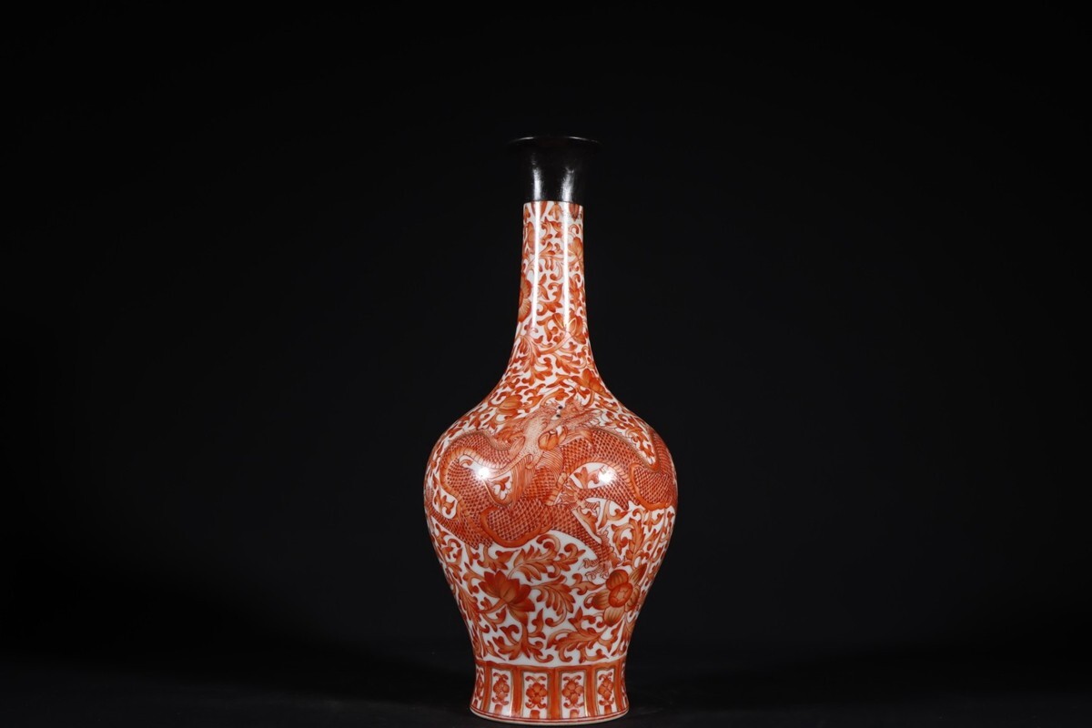 - 「清 雍正年製 陶磁器 礬紅龍穿花卉紋 膽瓶」染付 置物 擺件 古賞物 中国古美術 旧蔵出