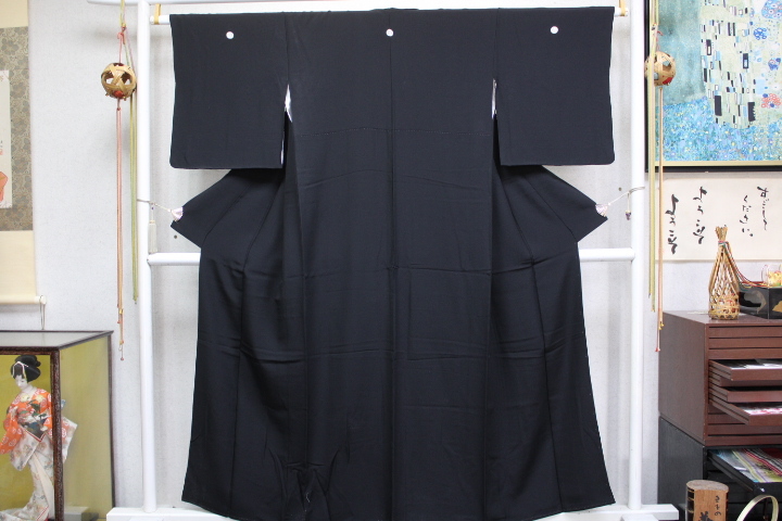 - きもの今昔8730 黒の礼装 喪服袷きもの 正絹一越ちりめん地 1回だけ使用しました 家紋「五瓜に唐花」身丈155cm