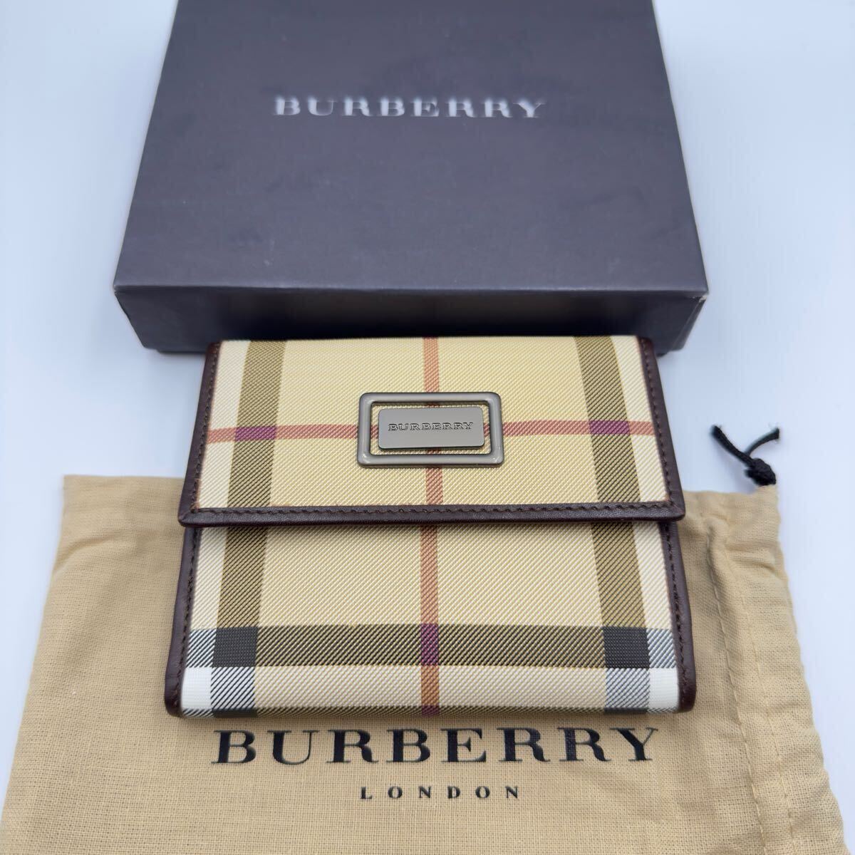 > 未使用品 バーバリー 二つ折り財布 ダークブラウン チェック PVC 小銭入れ付き メンズ レディース カードケース コインケース レザー