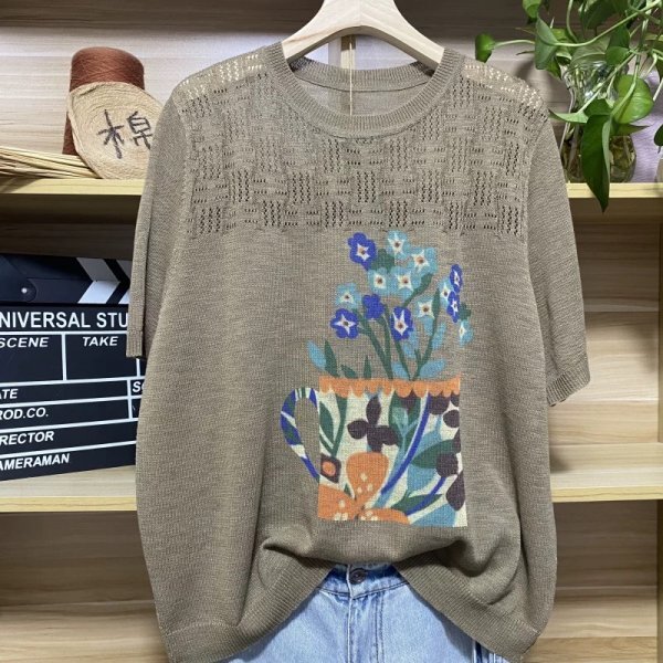 - 25zy サマーニット レディース トップス 高質 ラフ 麻タッチニット チュニック ナチュラル 麻混 サラサラ 涼感 Tシャツ プリント花柄4