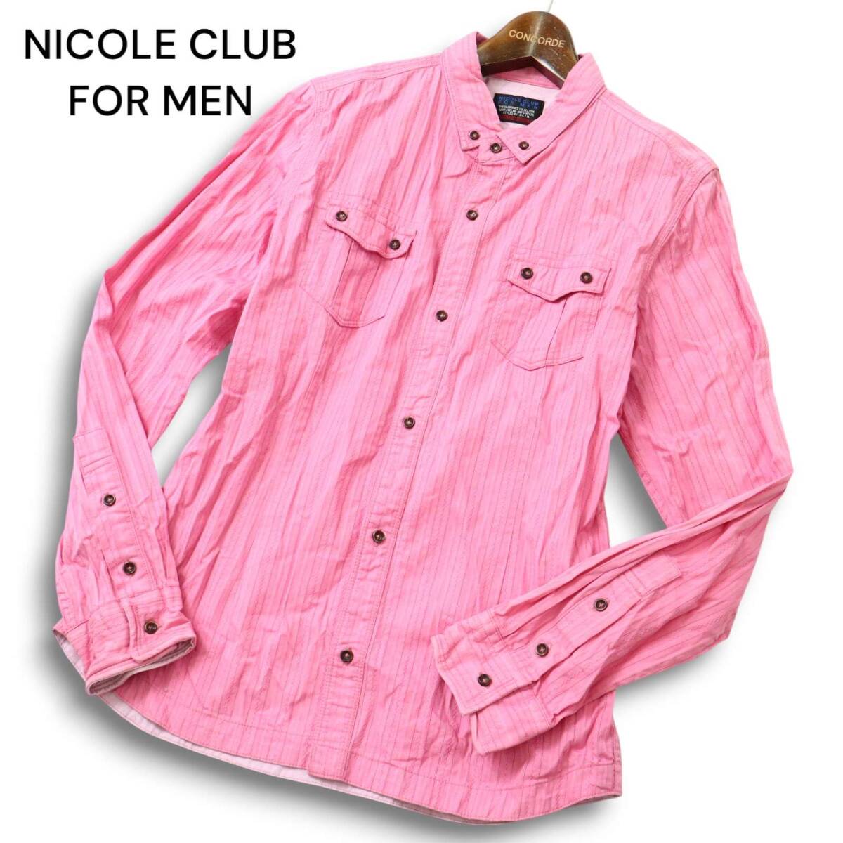 > NICOLE CLUB FOR MEN ニコルクラブ フォーメン 通年 袖口ワイヤー★ 長袖 ボタンダウン ストライプ シャツ Sz.48 メンズ