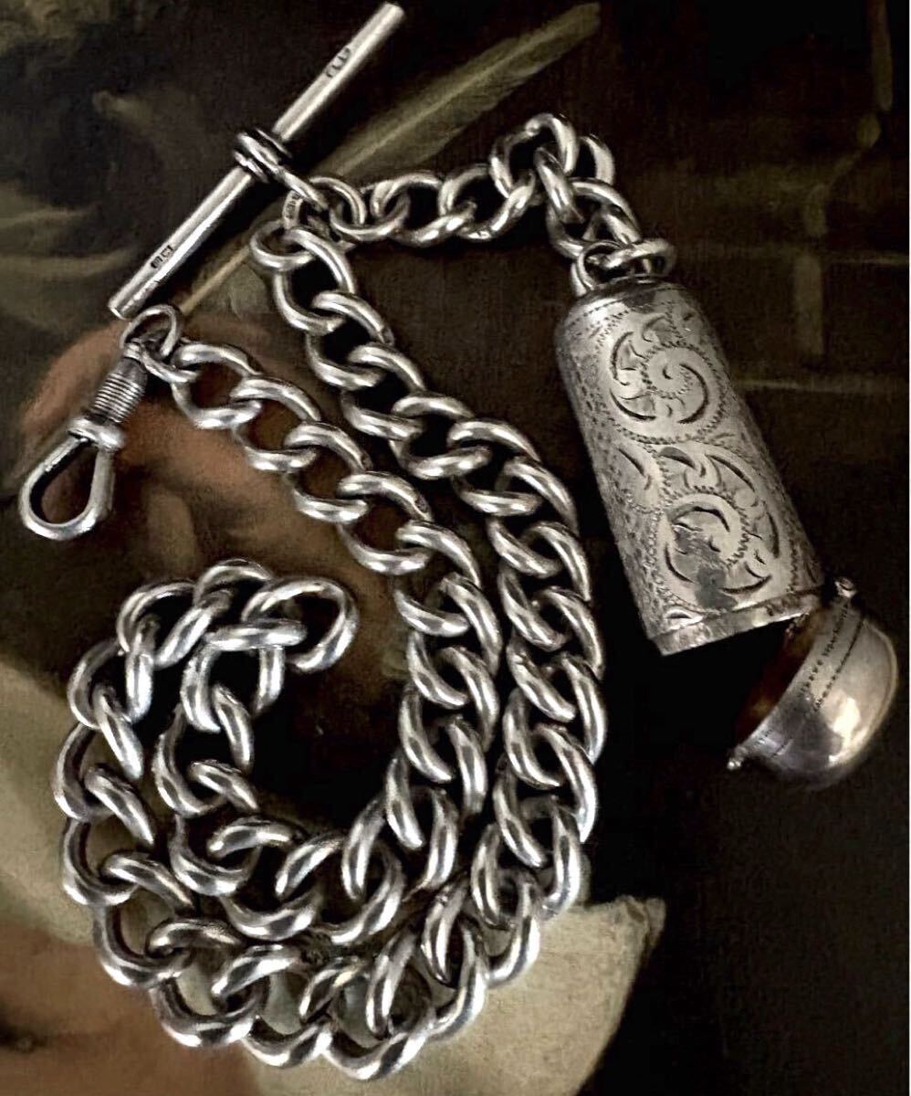 > 英国アンティーク シャルロット/ホルダー/ケース フォブ 懐中時計/ウオッチ/アルバートチェーン シルバー純銀56.3gビクトリア期1897年HB社