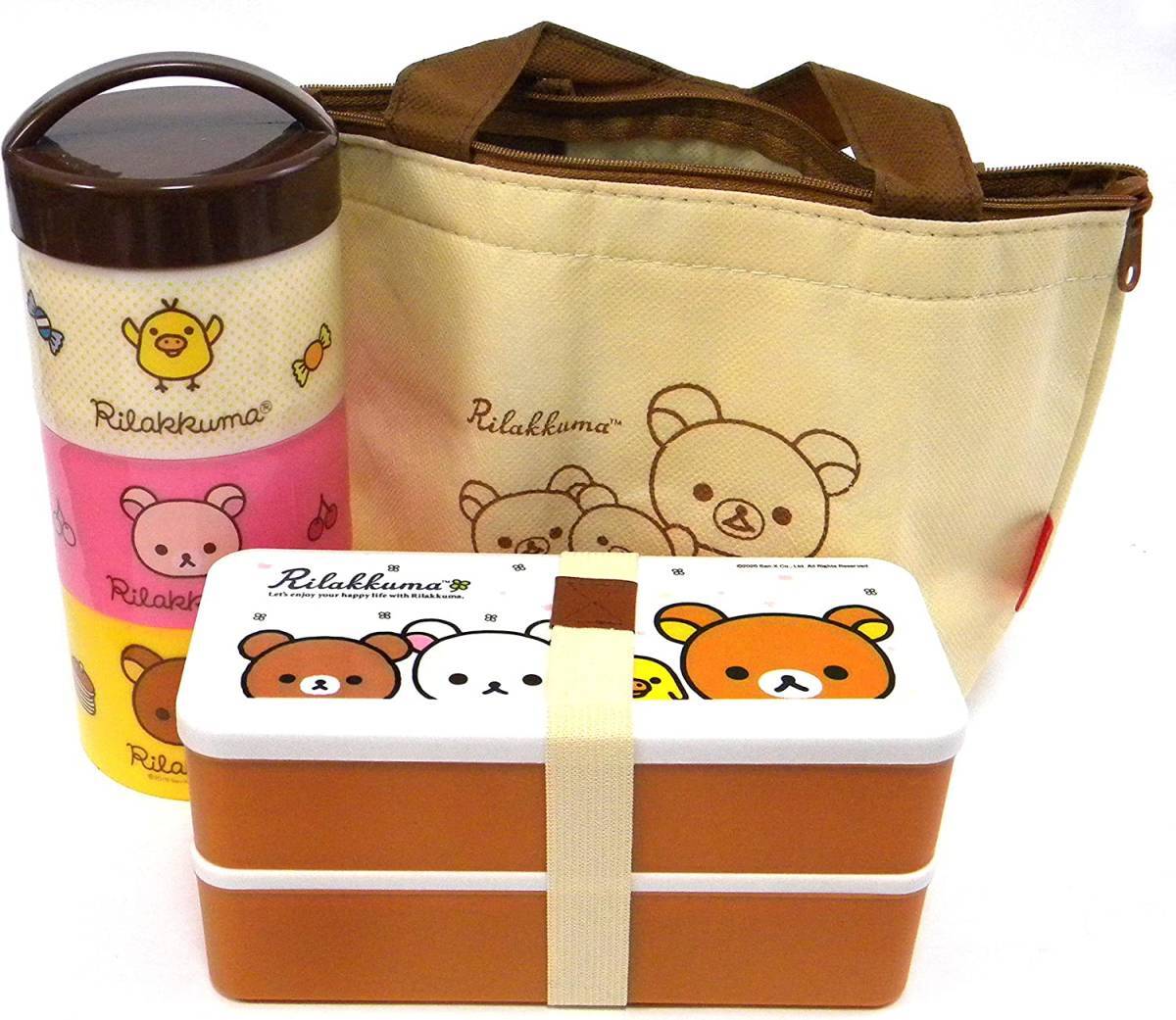 - ★ リラックマ ★ 二段式ランチボックス 保冷バッグセット(フォーク付)& 三段 ボトル型 ランチ BOX(箸付)/ San-X・Joshin
