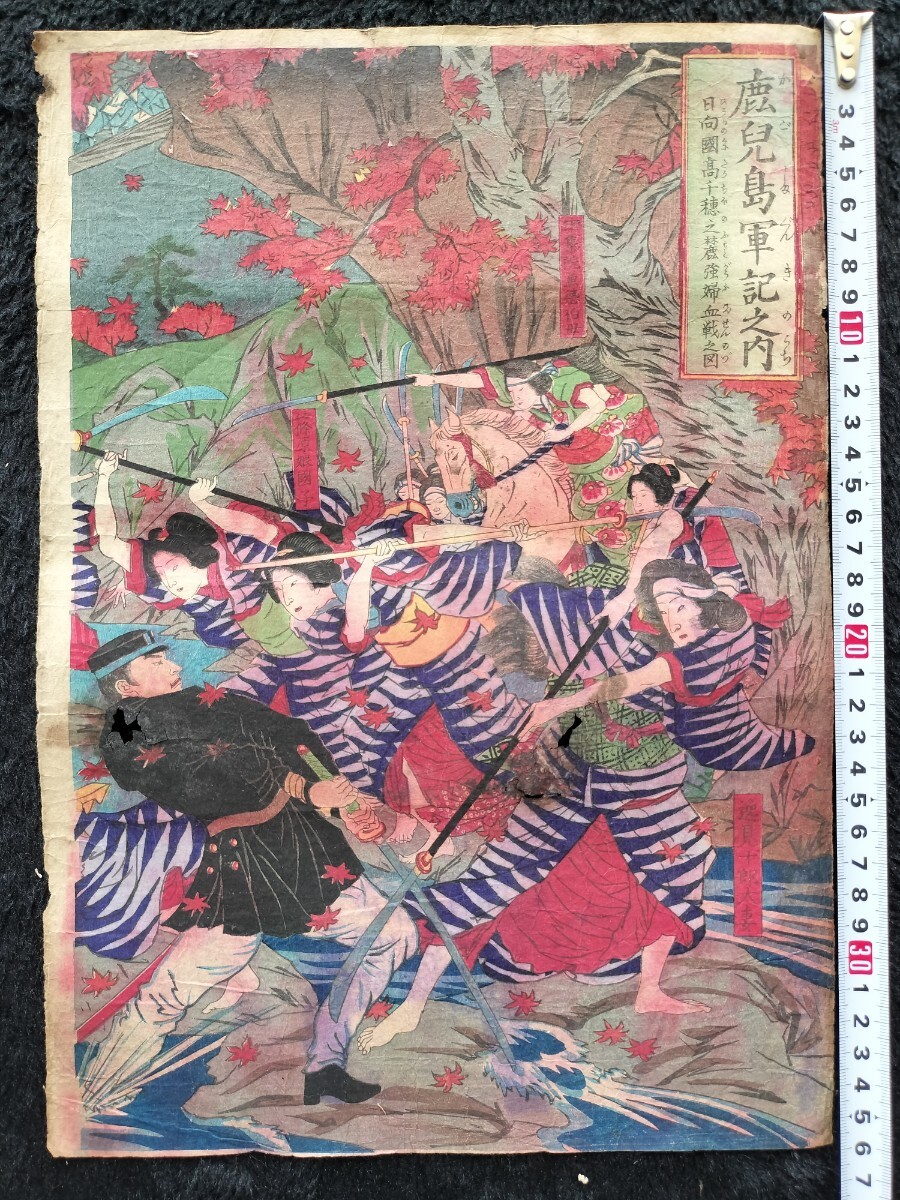 - 明治期/真作 歌川国政「鹿児島軍記之内 日向国高千穂之麓強婦血戦之図」本物浮世絵木版画 西南戦争 武者絵 戦争絵 錦絵 大判 裏打ち