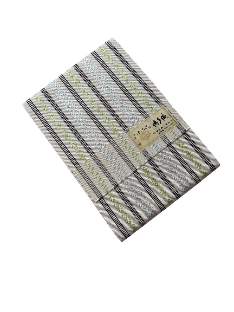 - 【新品未使用】博多織四寸半幅帯 献上柄 白地 黄緑色 薄紫 単衣 上品 お洒落