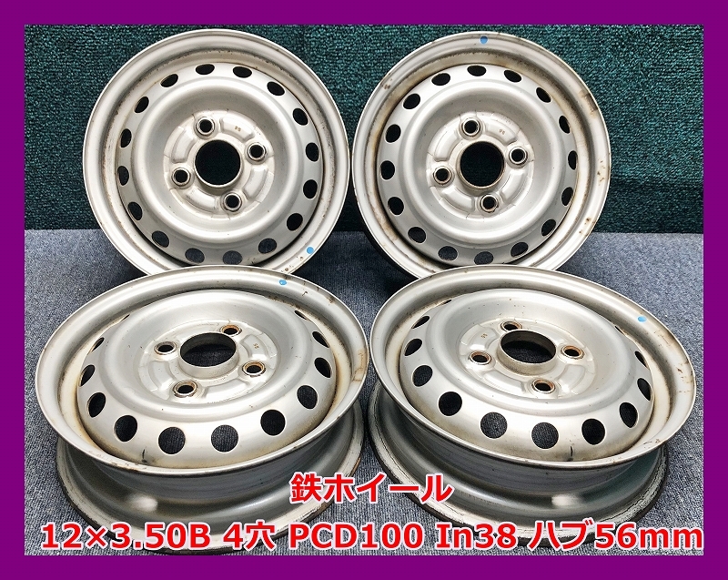 - ★12インチ 中古 鉄ホイール 4本 4穴 PCD100 In38(実寸) ハブ56mm★
