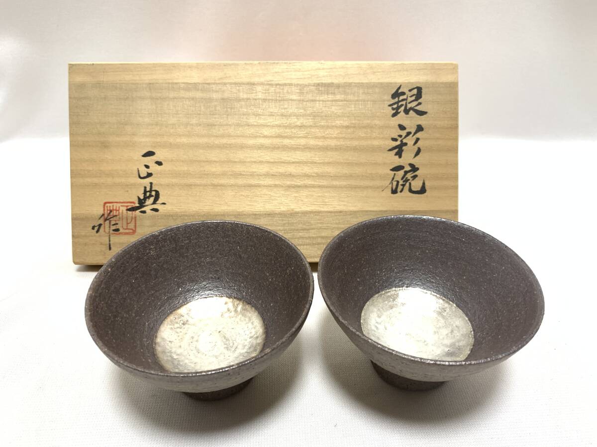 > u462 未使用保管品 「波多野正典」 正典 作 銀彩碗 夫婦茶碗 共布 共箱 ペア 桐箱入り