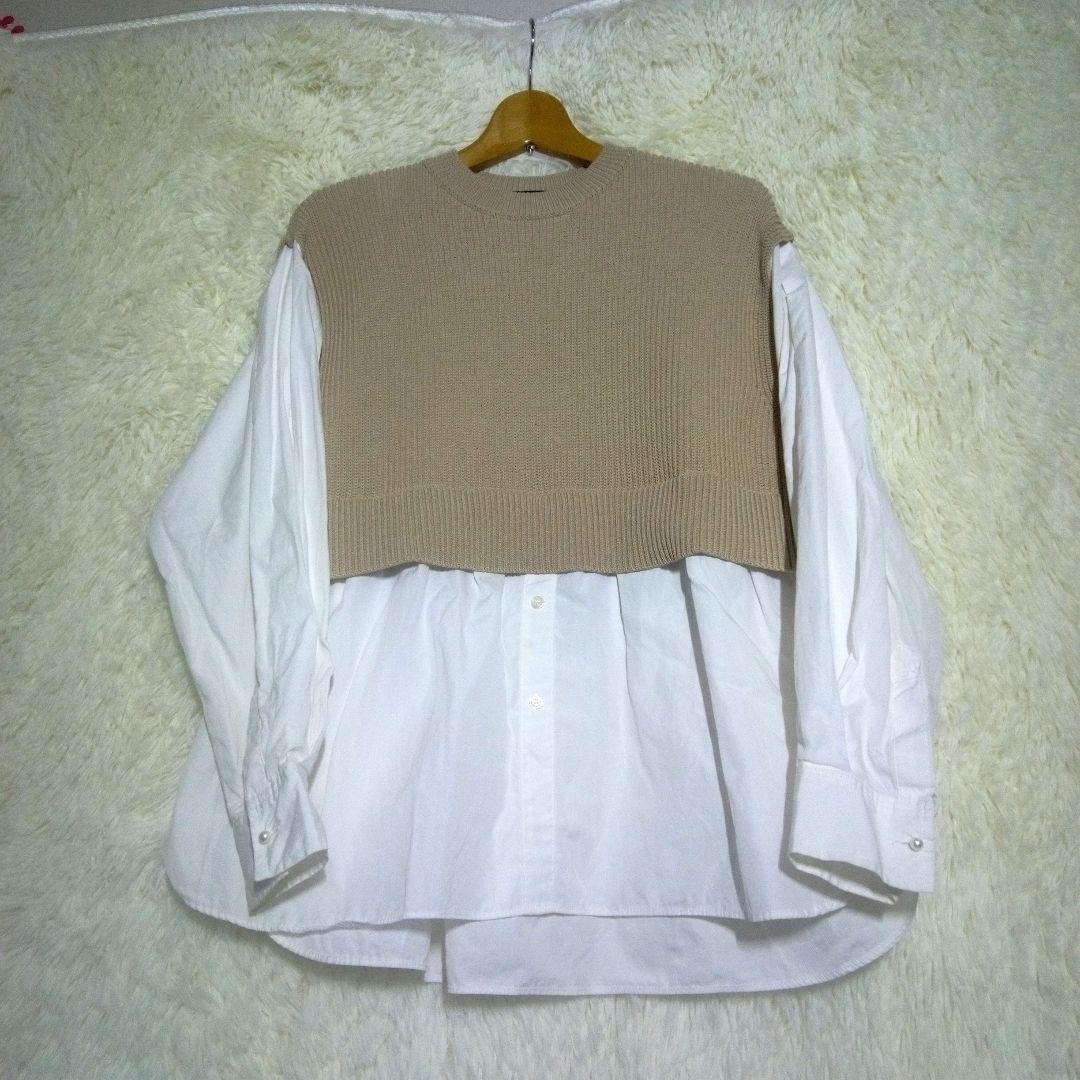 - SHIPS シップス【F】レディース ドッキングニットシャツ ブラウス ベージュ