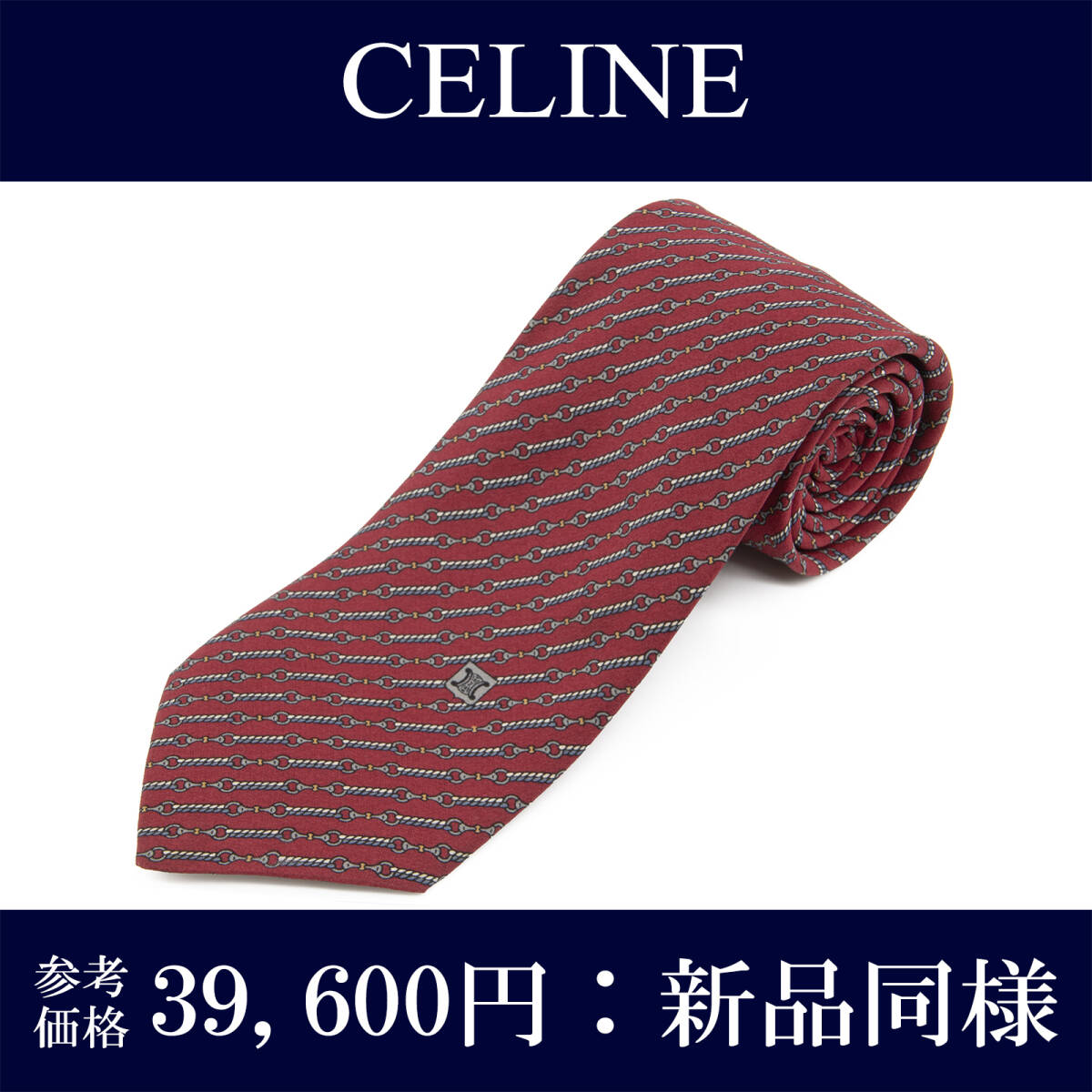 > 送料無料 セリーヌ ネクタイ レギュラータイ 新品同様 シルク 赤 グレー 青 白 ストライプ ホースビット ロゴ マーク ブランド 綺麗 P090