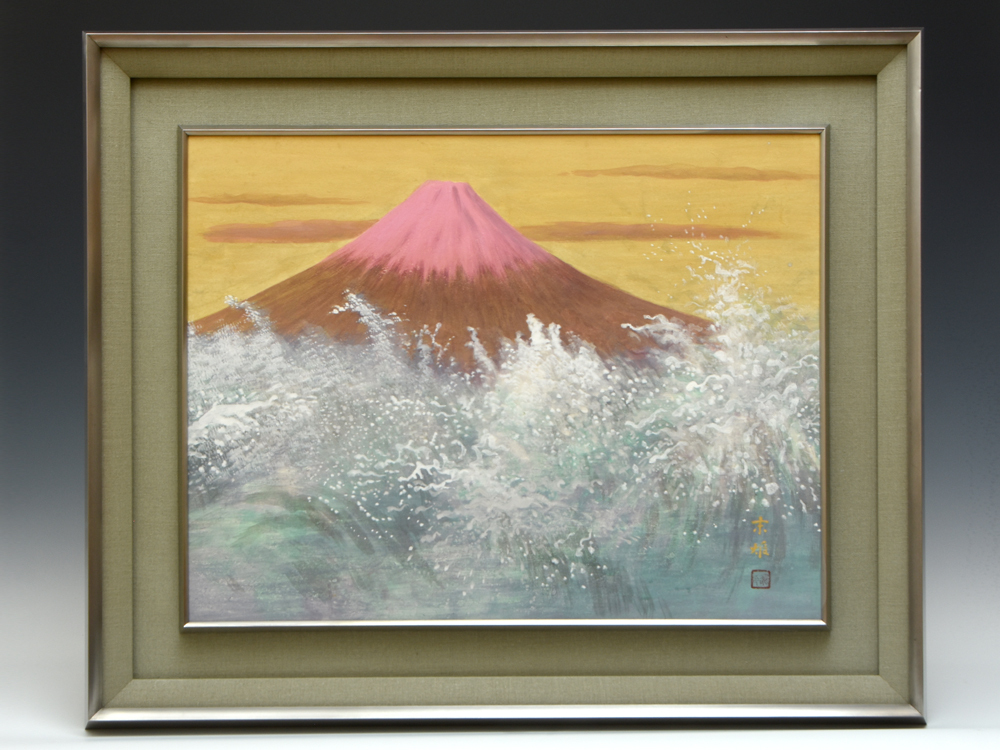 > 【真作】川本末雄 日本画「遠富士」署名落款有 共シール 額装有 岩彩 専用箱 風景画 絵画 アート インテリア y2844o