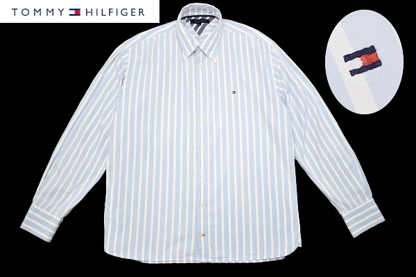 - Y-8989★送料無料★TOMMY HILFIGER トミーヒルフィガー★正規品 胸にロゴ刺繍 ブルー ストライプ ボタンダウン 長袖 ドレス シャツ XL