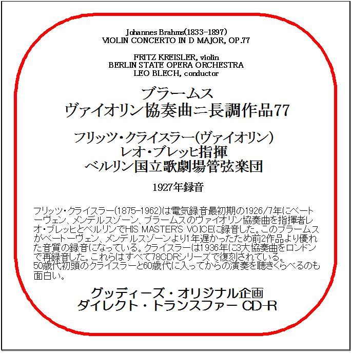- ブラームス:ヴァイオリン協奏曲/フリッツ・クライスラー/送料無料/ダイレクト・トランスファー CD-R