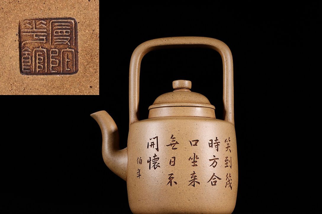 - ◆羽彰・古美術◆Y4123詩文刻絵提梁紫砂壺 在銘 曼華館 何心舟 清時代/紫砂 煎茶道具 朱泥 茶壺