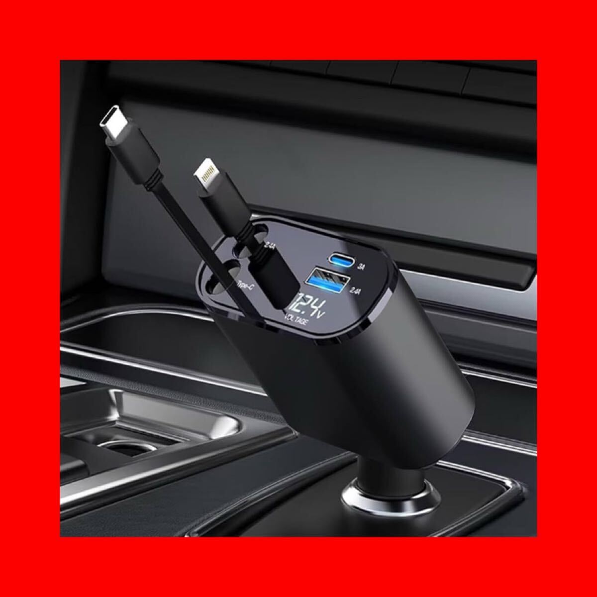 - シガーソケット 急速充電 USB カーチャージャー 巻き取り式ケーブル Type-C Lightning20W急速 DC12/24V車対応2025/7/21