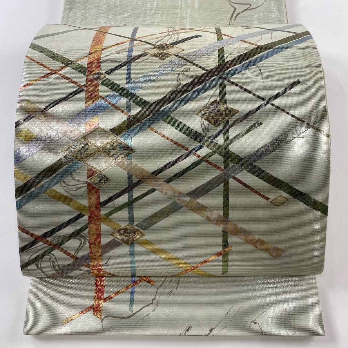 - 袋帯 秀品 菱 幾何学 箔 薄緑 お太鼓柄 正絹 【中古】