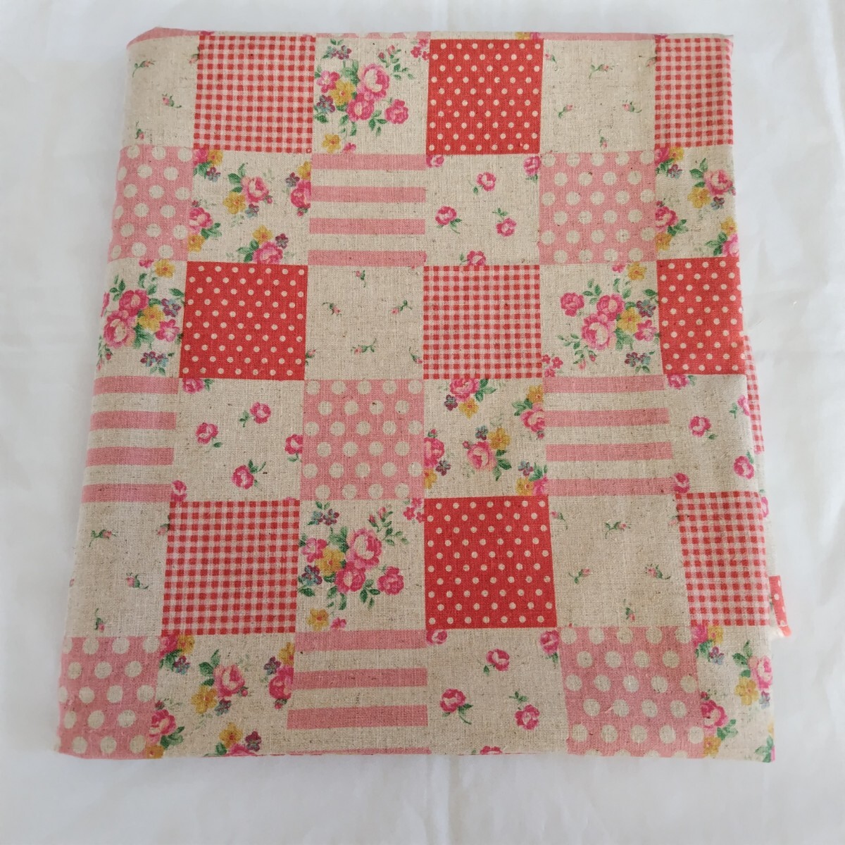 - はぎれ 綿麻生地 薔薇パッチワーク柄 ピンク系 110×100