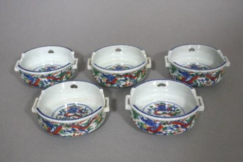 - 骨董,清水焼 大明萬暦年製(銘) 色絵雲龍文耳付五寸鉢 5客