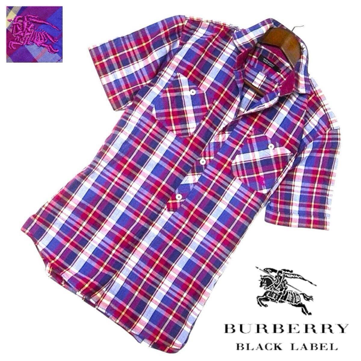 - 希少なL! 美品 バーバリーブラックレーベル BIGホース刺繍 爽やかノバチェック柄 ロールアップ 2WAY 半袖 シャツ 3/L BURBERRY BLACK LABEL