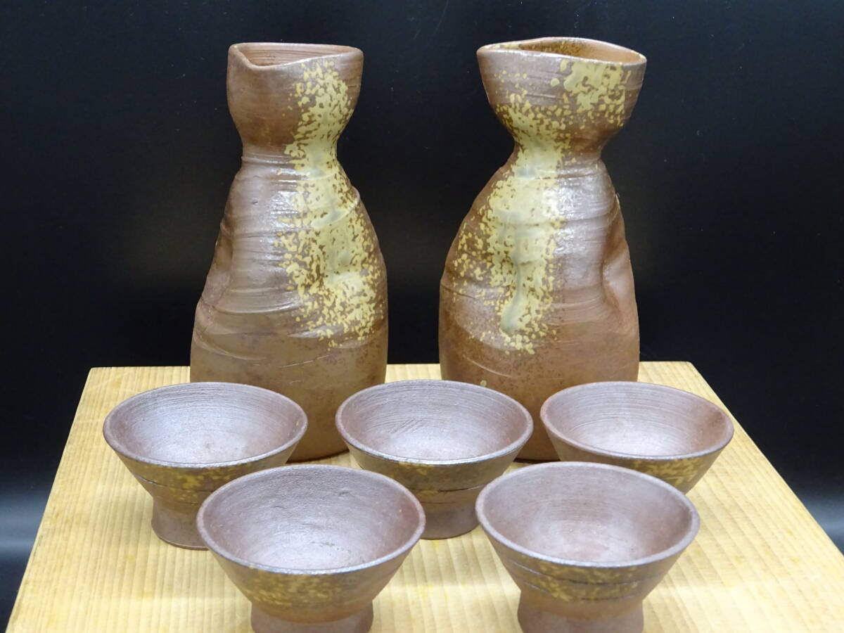 > 備前焼 人気実力作家 名工木村陶峰 ★備前酒器揃え(徳利2本、酒盃5個)共箱付 酒器 茶碗 壺 茶道具