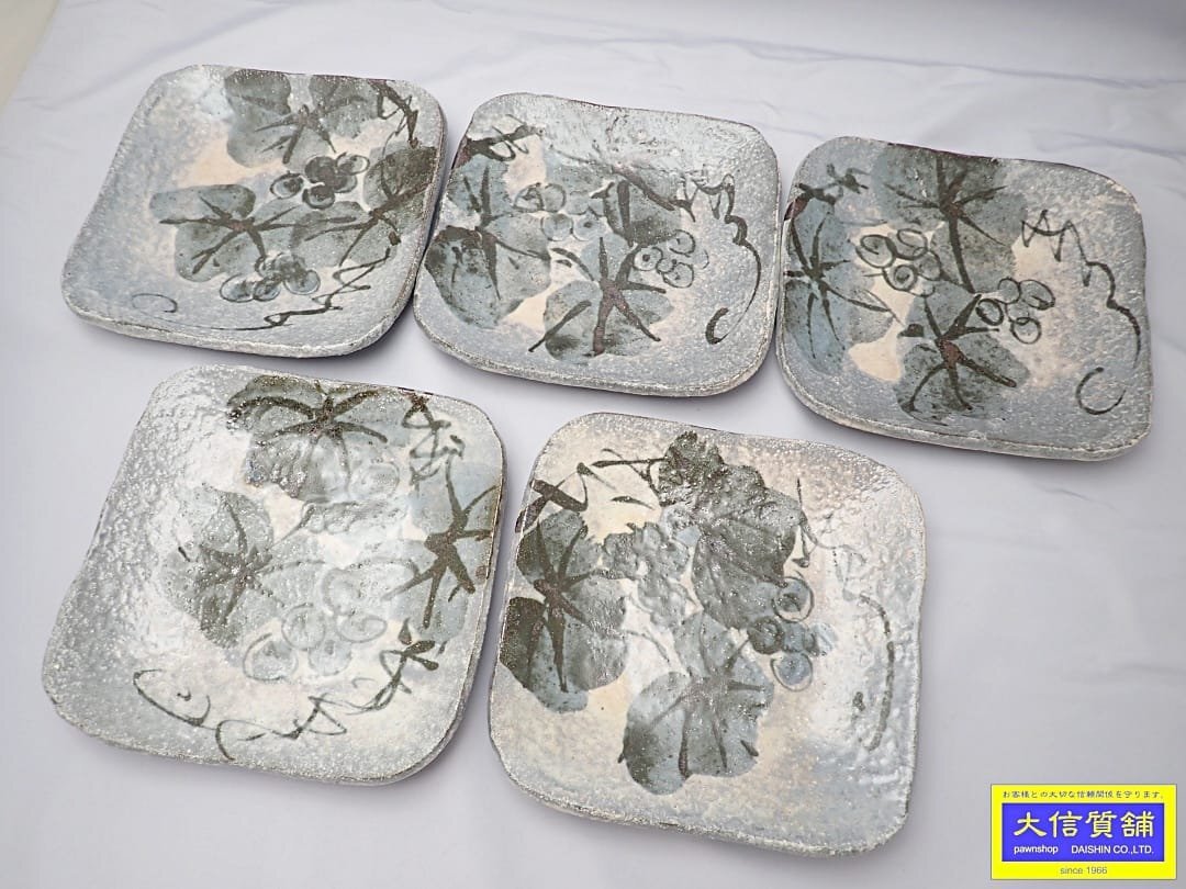 > 美濃焼陶芸 祥山 角皿 粉引葡萄文角皿 5枚セット 中古B+ 【送料無料】 D-2460