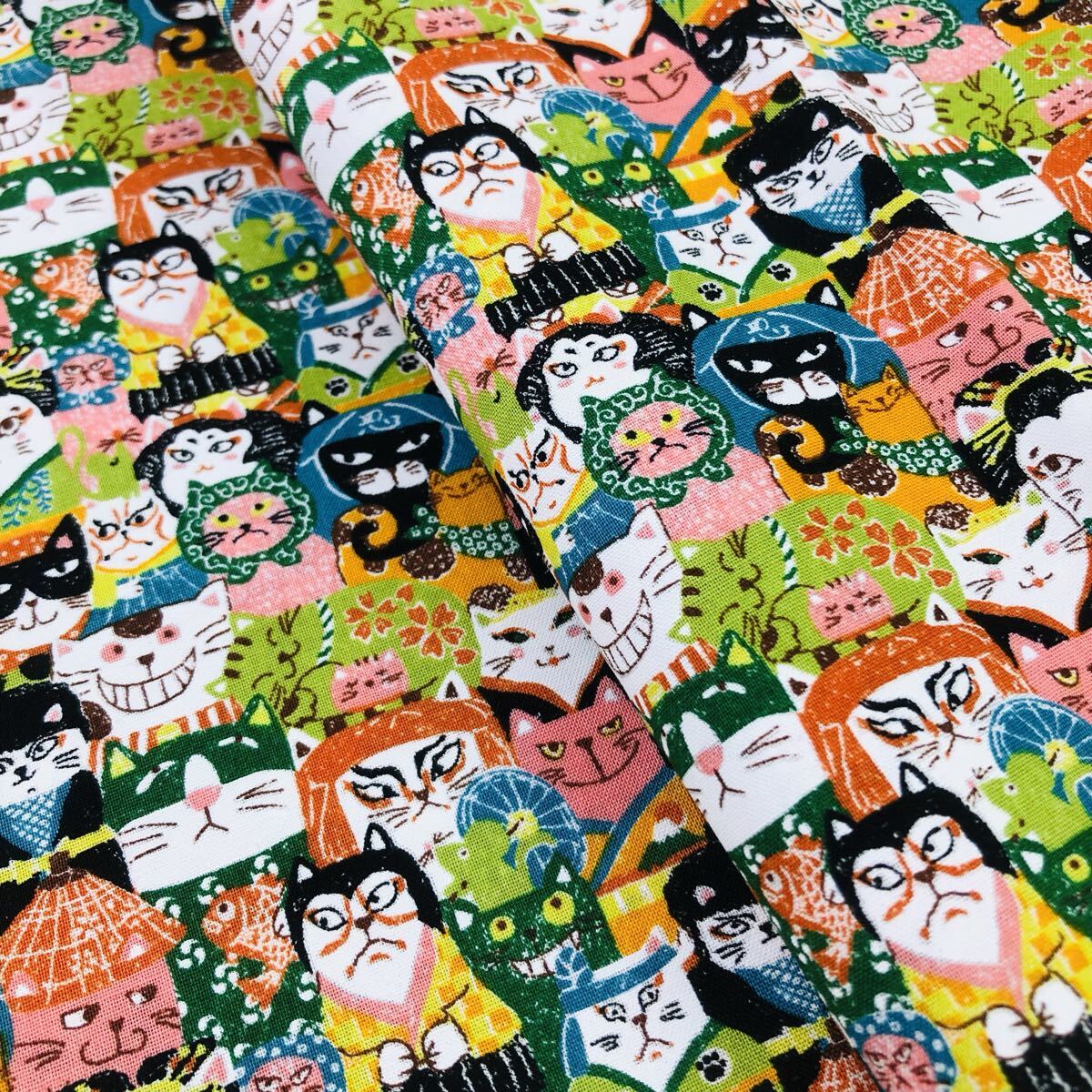 - 50cm スケアー はぎれ ネコ柄 歌舞伎 くまどり 忍者 小物作りに 108×50 猫 日本製