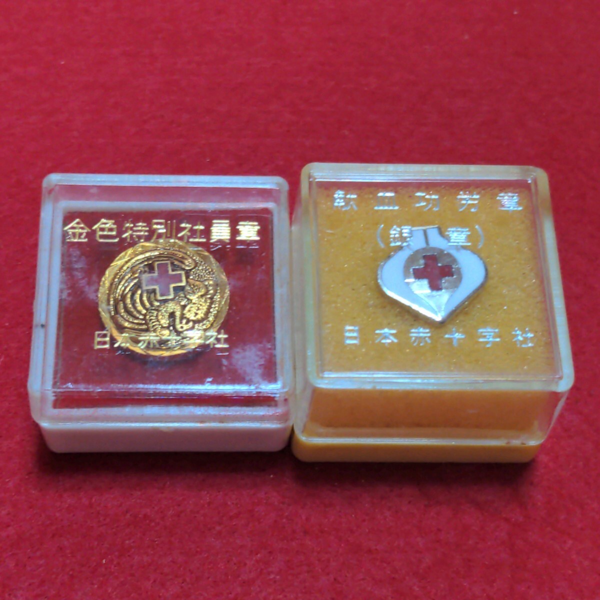 - 2点 日本赤十字社 ピンバッジ 金色特別社員章 献血功労章 銀章 コレクション