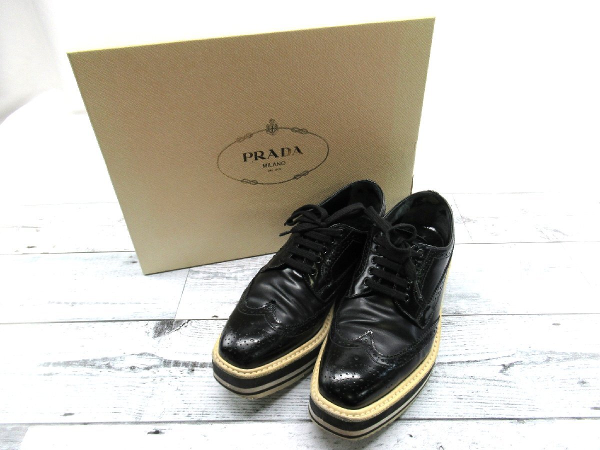 > ☆【B送900円】2100 PRADA プラダ 厚底ローファー レースアップシューズ ブラック レザー ウィングチップ イタリア製 36 1/2
