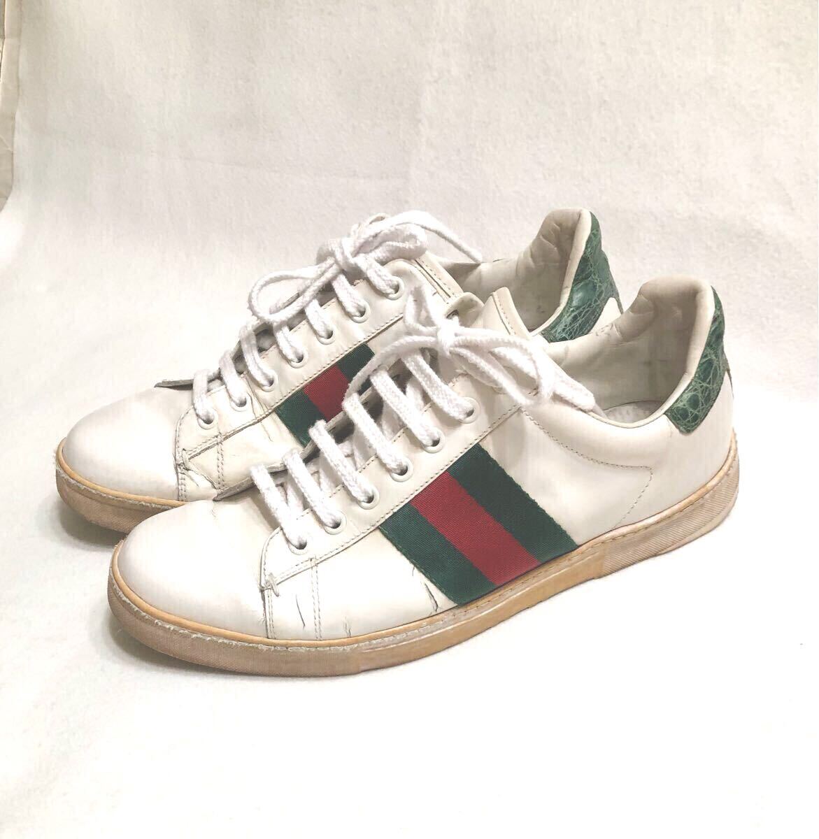 > 正規品◆GUCCI グッチエース シェリーライン スニーカー ウェブストライプ レザー メンズ クロコ 革靴 ホワイト白サイズ 39(24.5cm)
