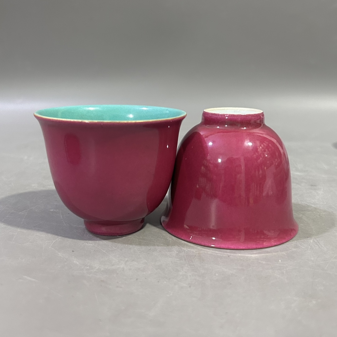 - ■BC143■大清雍正年制款 臙脂紅釉内緑杯一対 時代物 古玩 唐物 古陶磁器■