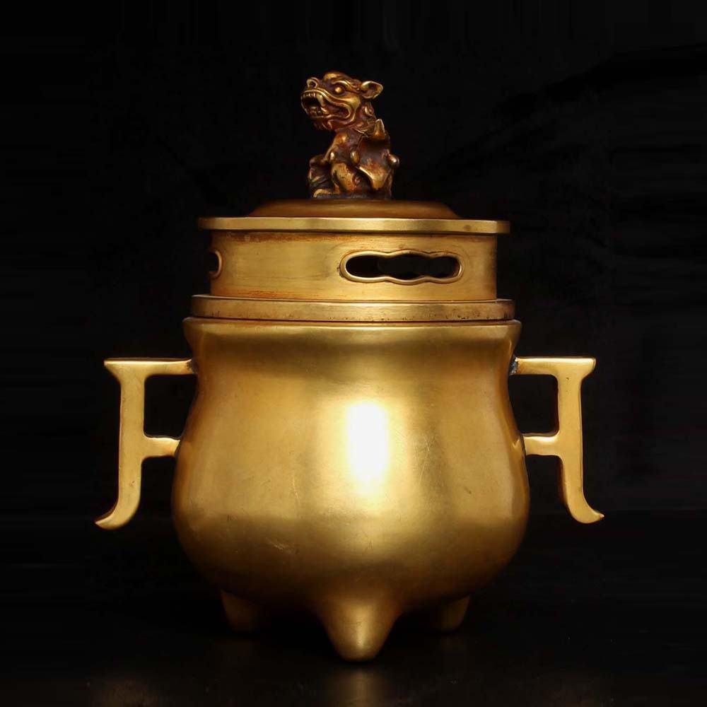 - 唐物 明 宣德年製 紫銅塗金 獅鈕熏爐 香道具 銅製品 銅器 古美術品 時代物 中国古玩 骨董品 D67
