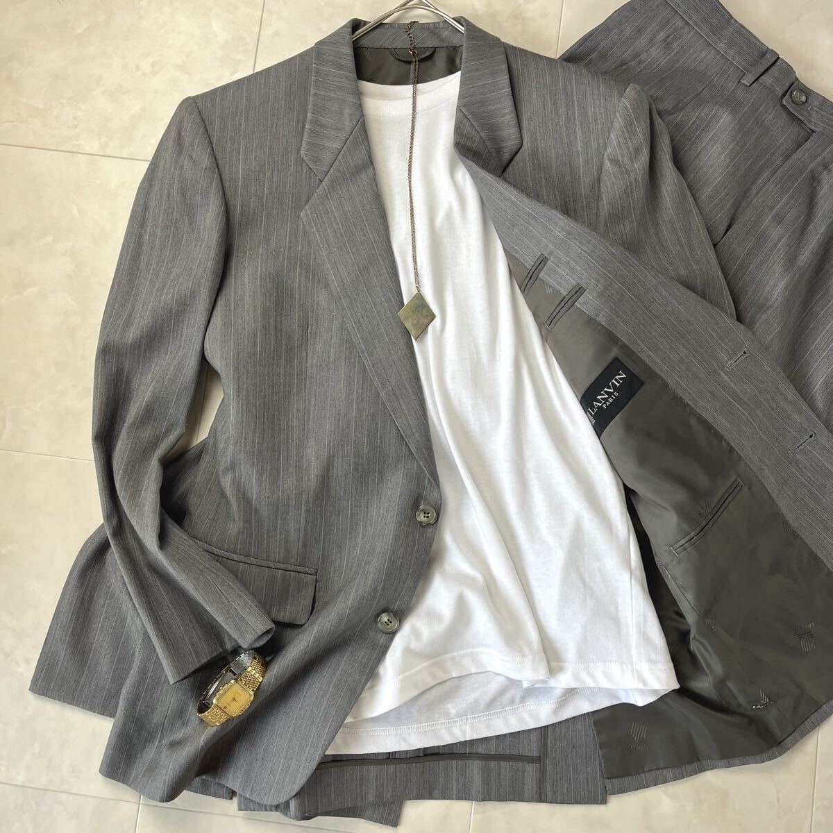 - 定価10万超 高級 極美品L相当H48 LANVIN ランバン スーツ セットアップ 上品ストライプ 灰 グレー 通勤人気 裏地ロゴ