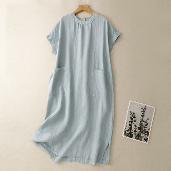 - 新入荷*シンプル ゆったり 無地 半袖 ロングワンピース 大人気 体型カバー ワンピース 着痩せ 大ポケット ミモレ丈ワンピース*ブルー