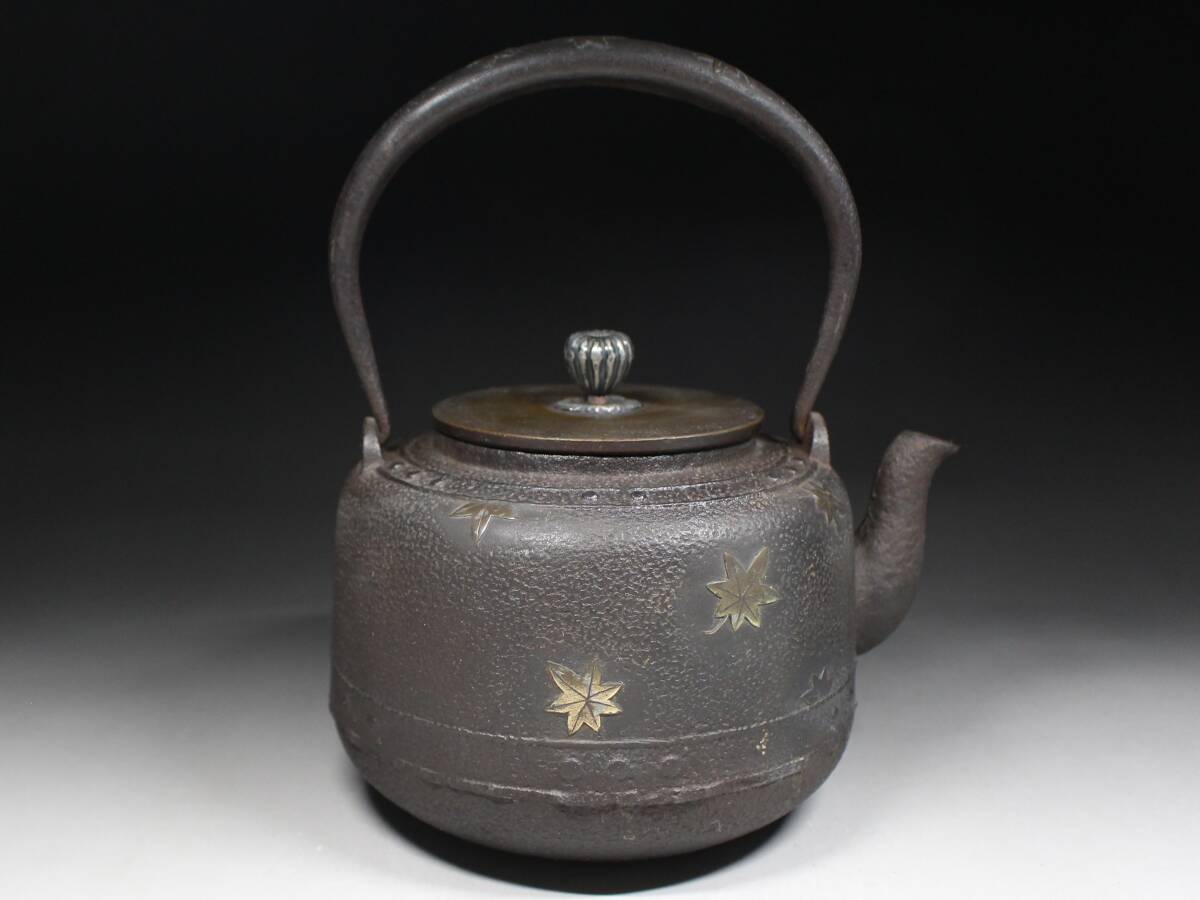 - ◆鉄瓶・岩肌地・紅葉・盛上げ彫・銅蓋・鐵瓶・湯沸・鉄壷・茶器・煎茶道具◆a8131h
