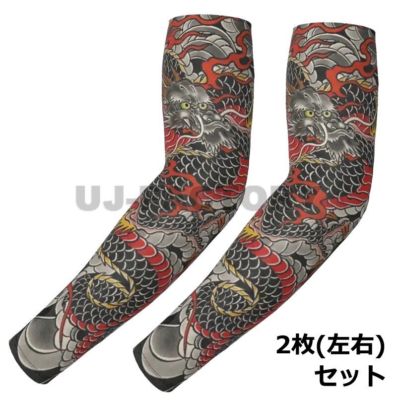- 【タトゥーアームカバー】★和柄 龍 2枚セット 和風 紫外線をブロック 厚手ニットタイプ 腕 フルカバー UV対策 男女兼用