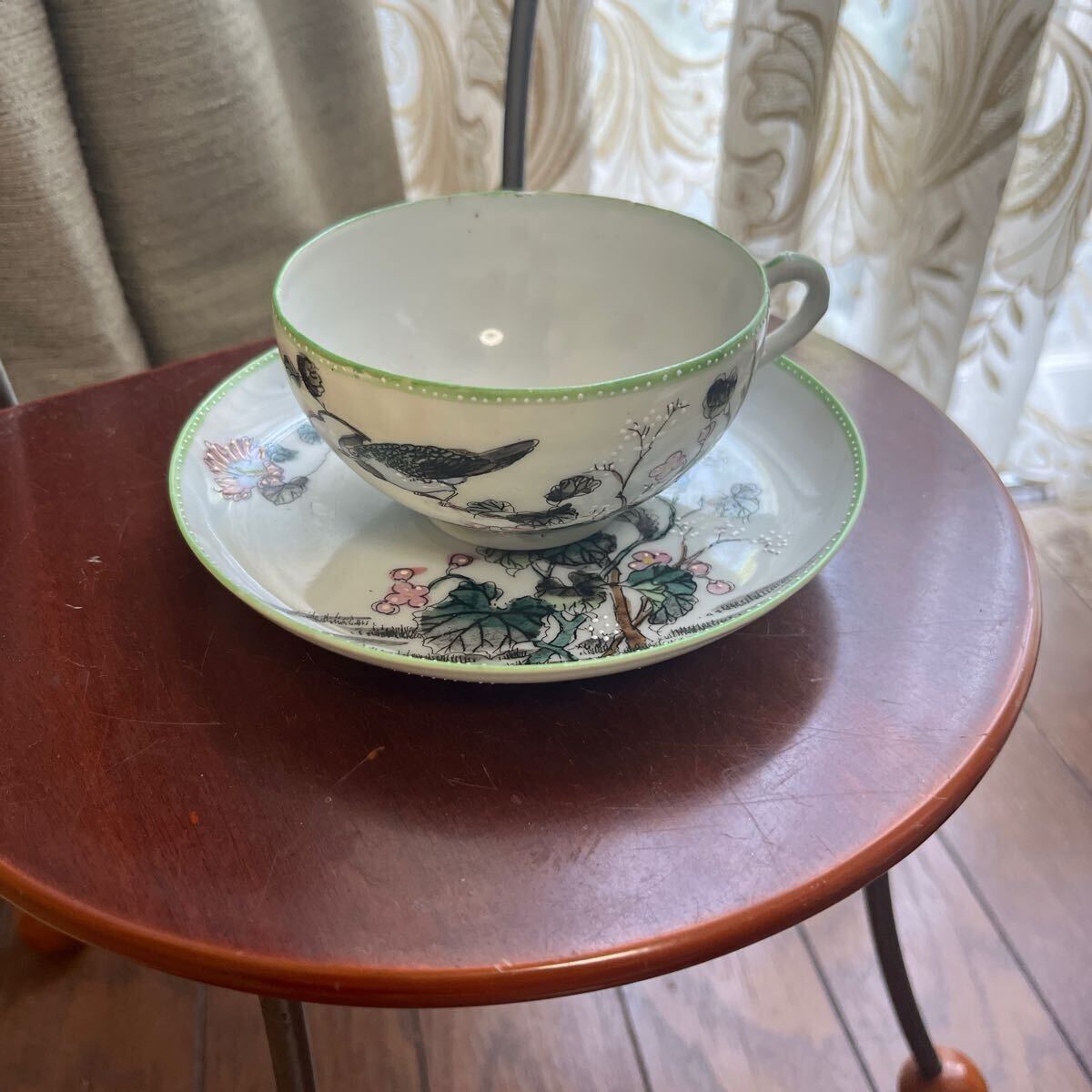 > 里帰り 大きめカップ&ソーサーNo.1 エッグシェル メイドインJAPAN 小鳥 点盛り オールドノリタケ同時期