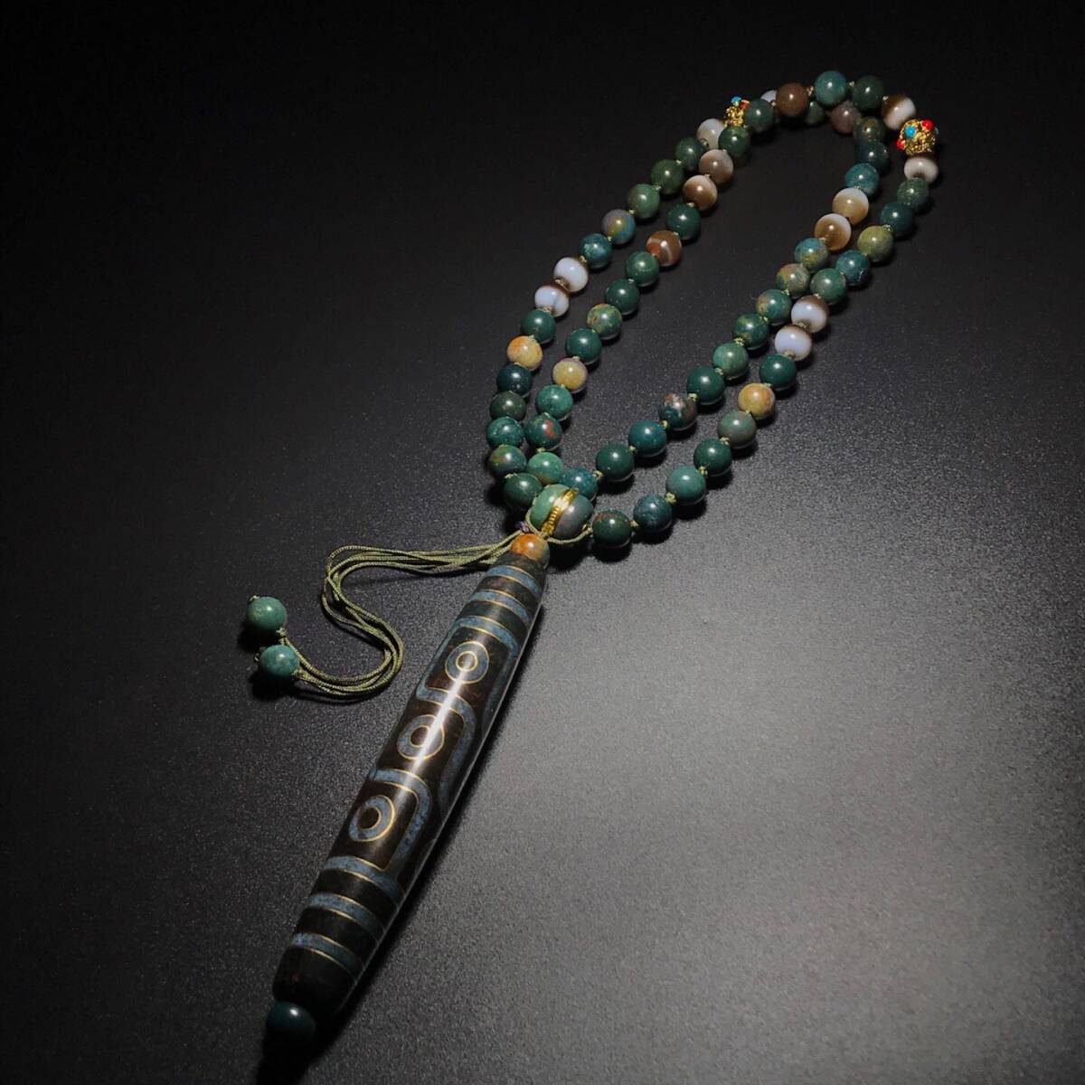 > 蔵友旧蔵出 瑪瑙製 細密彫 錯金絲 九眼象雄天珠ネックレス本 盒付 高油包漿 根付裝身具 希少珍品 貴重品 置物 古賞物 中国古玩中国古美術品