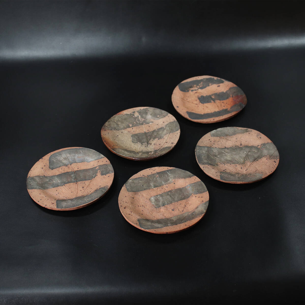 - 『北大路魯山人』作/銀彩備前土 草文 平向 五客揃(極:黒田陶々庵) <R19>